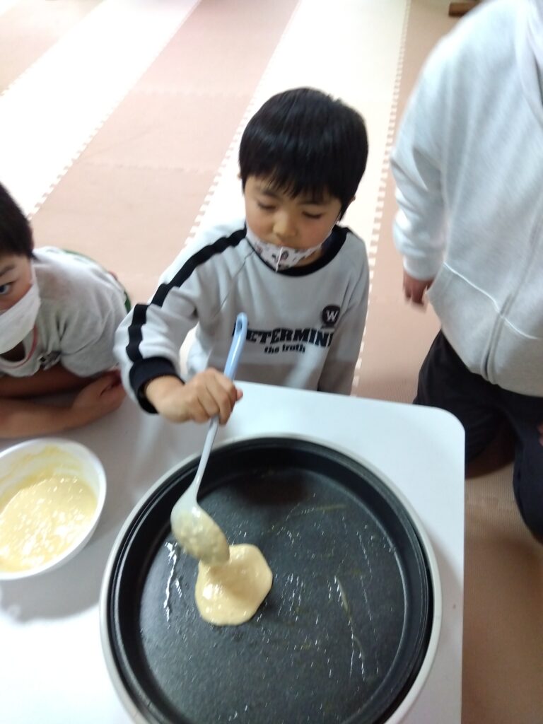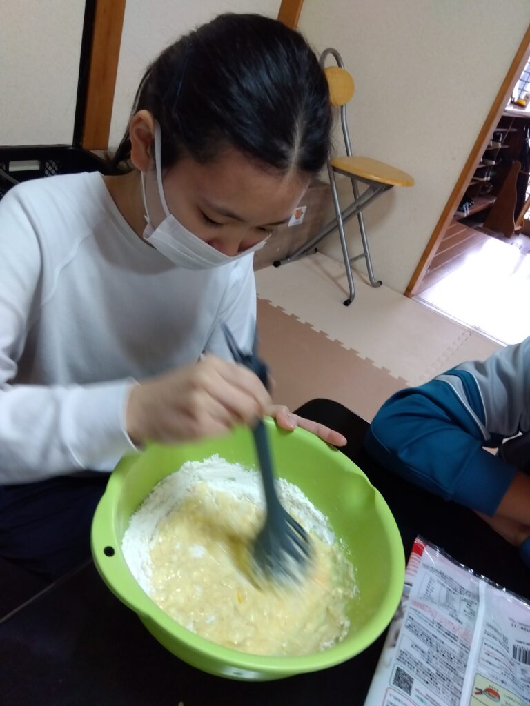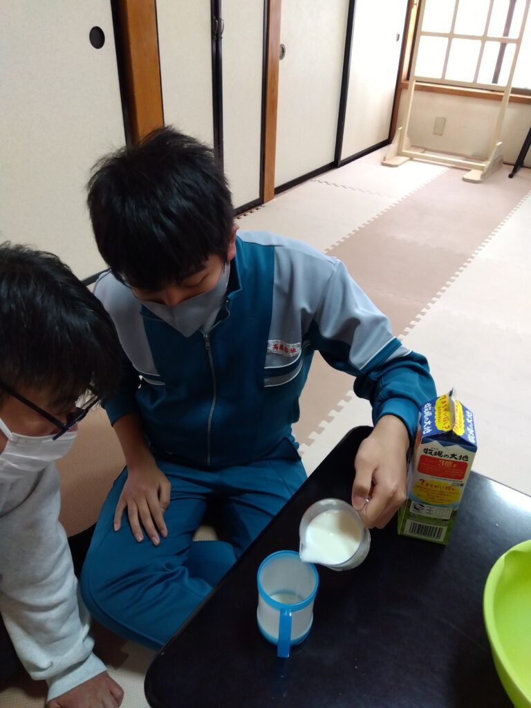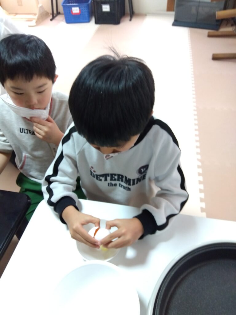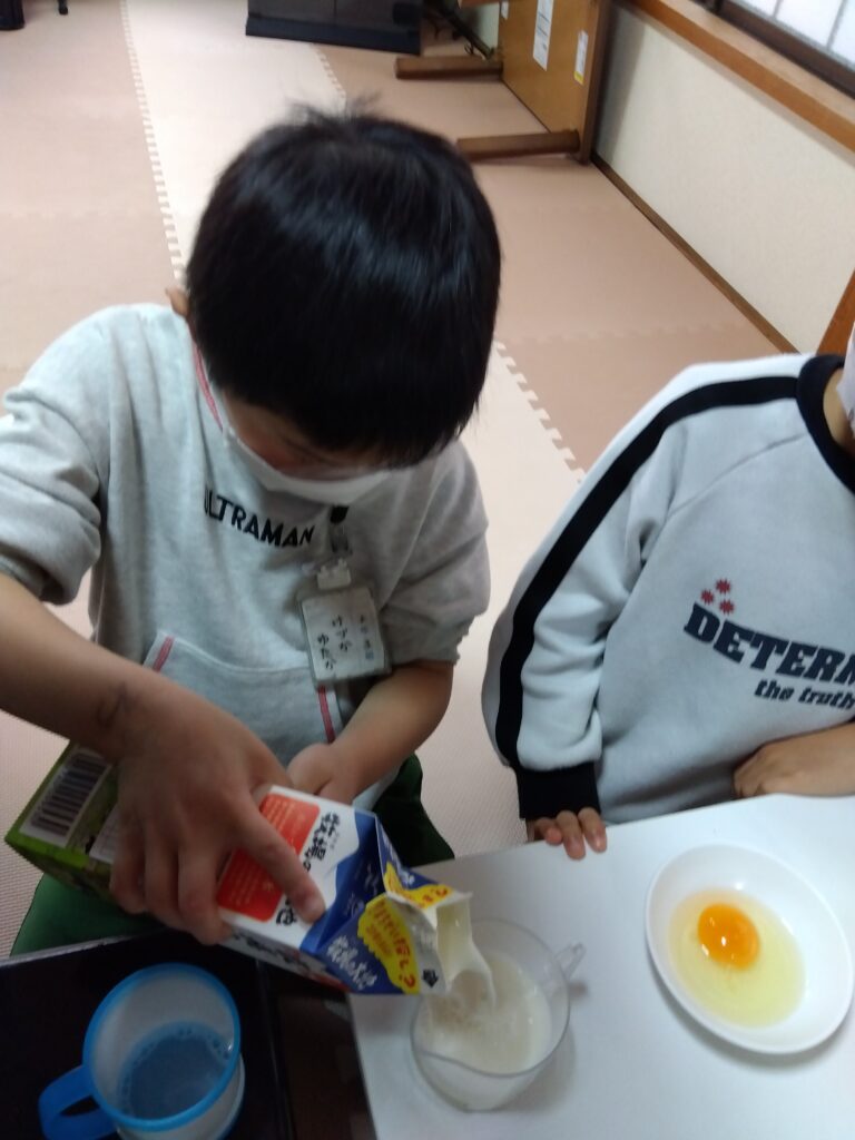 卵を割る人、牛乳を量る人それぞれ担当を決めてから作り始めました!