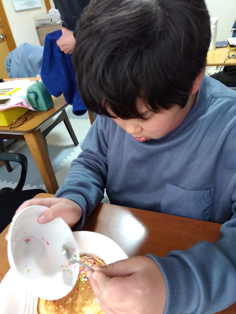 シロップをかけて、スプレーチョコをトッピング! うん、おいしいね(^o^)
