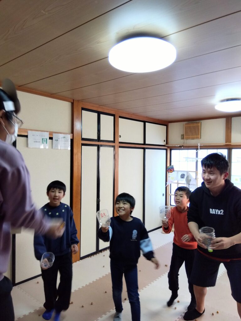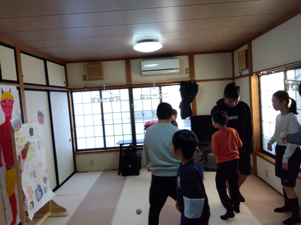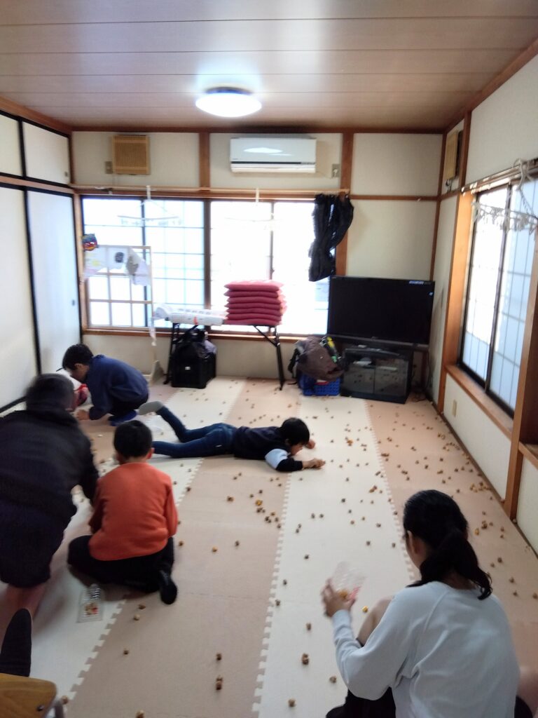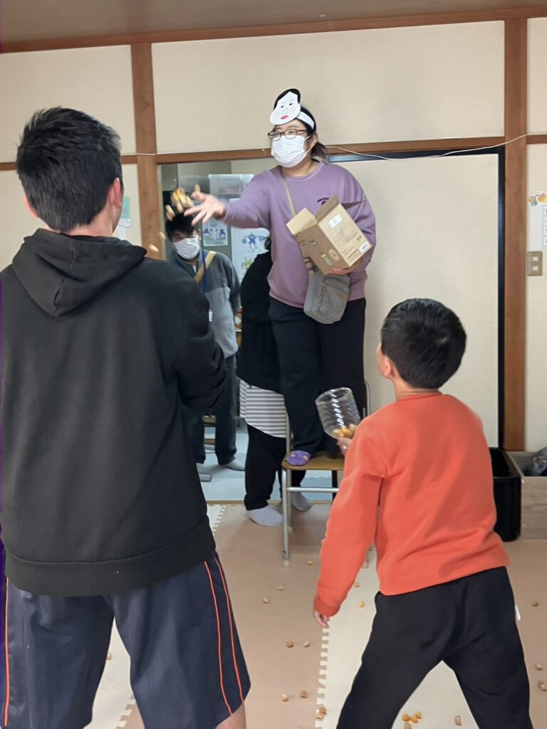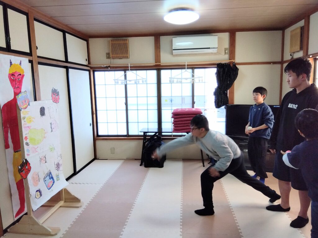 まずは自分で描いたやっつけたいオニに向かって鬼は外〜!