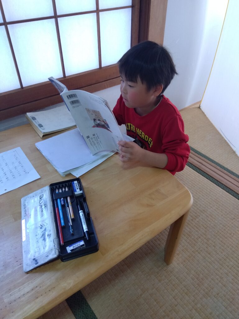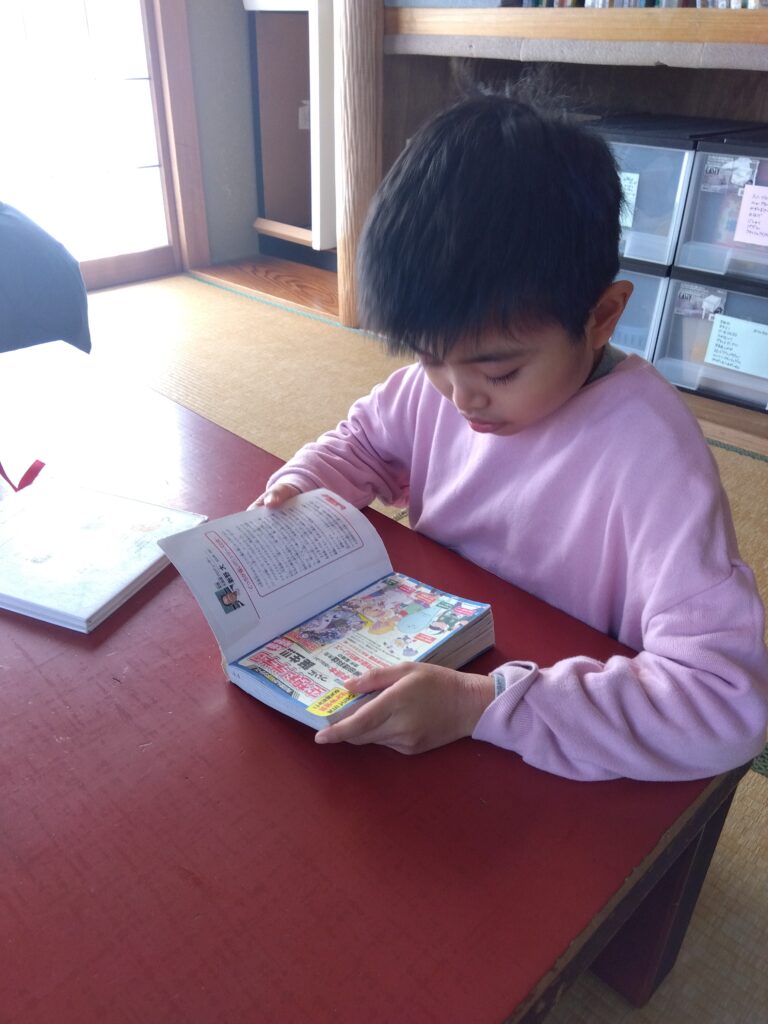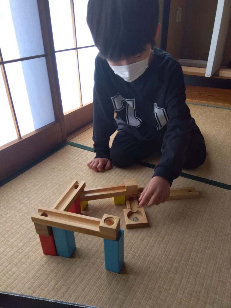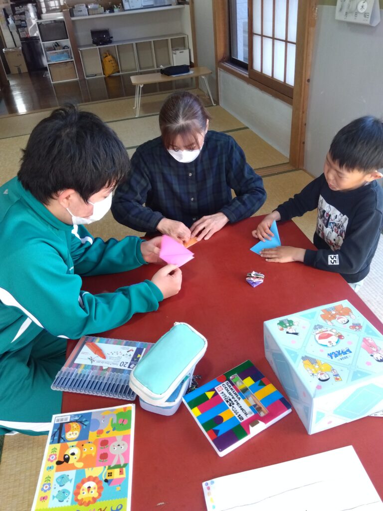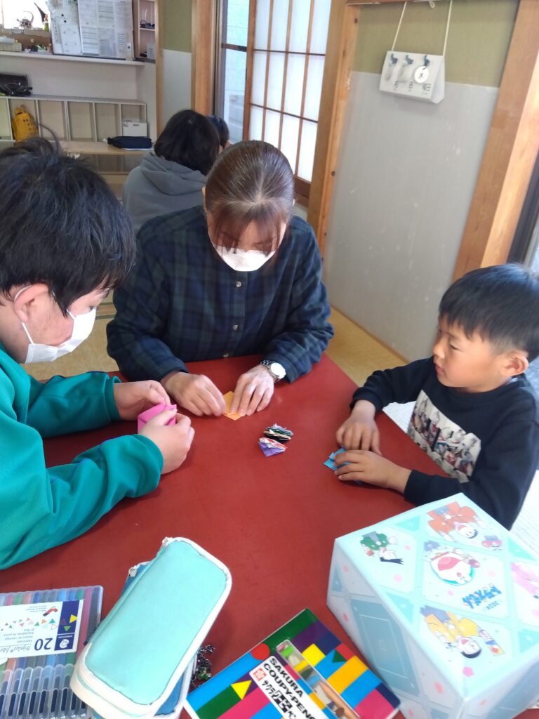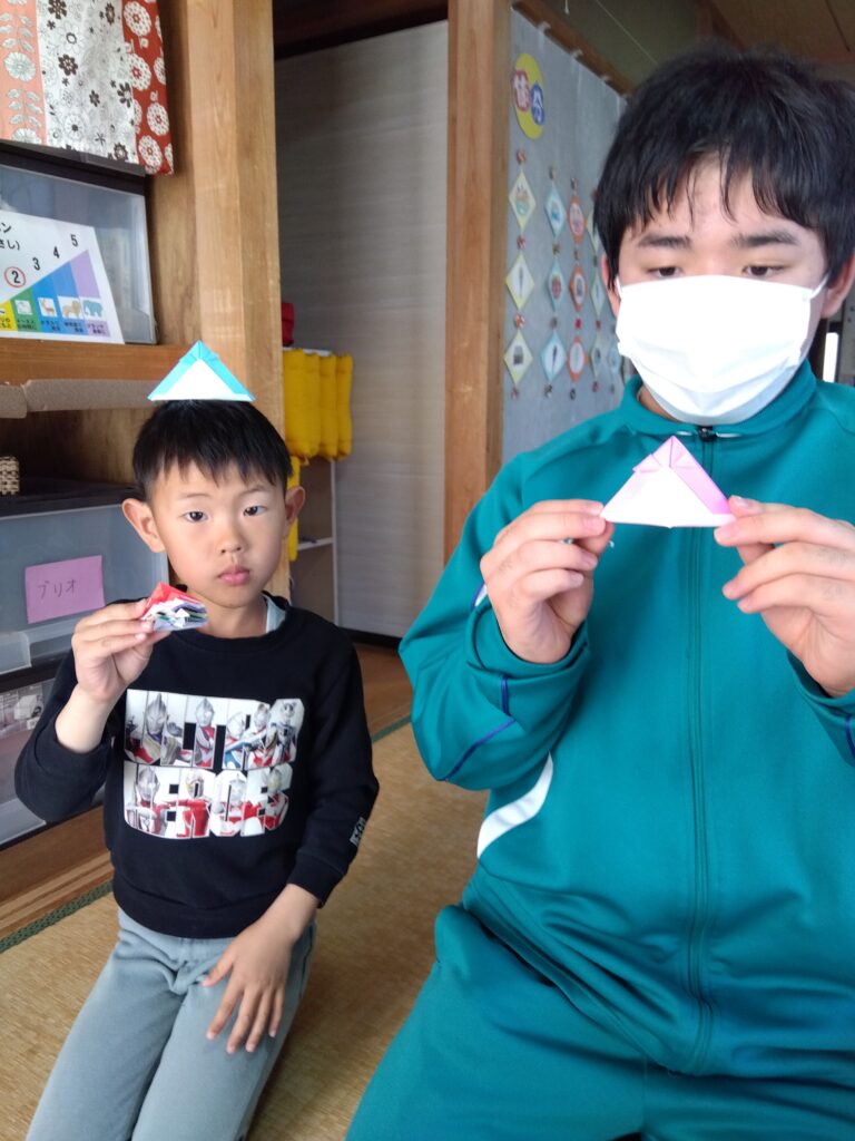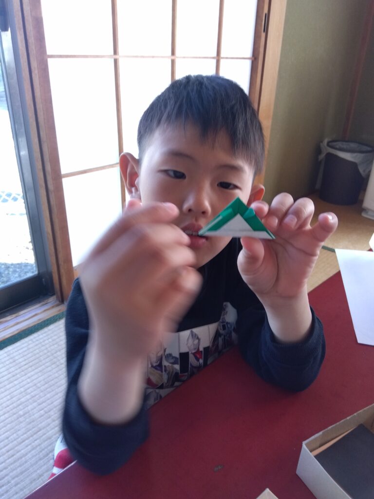 自由遊び中、器用に折り紙を折っています。ミニカブトを8個、あっという間に折って見せてくれました♪