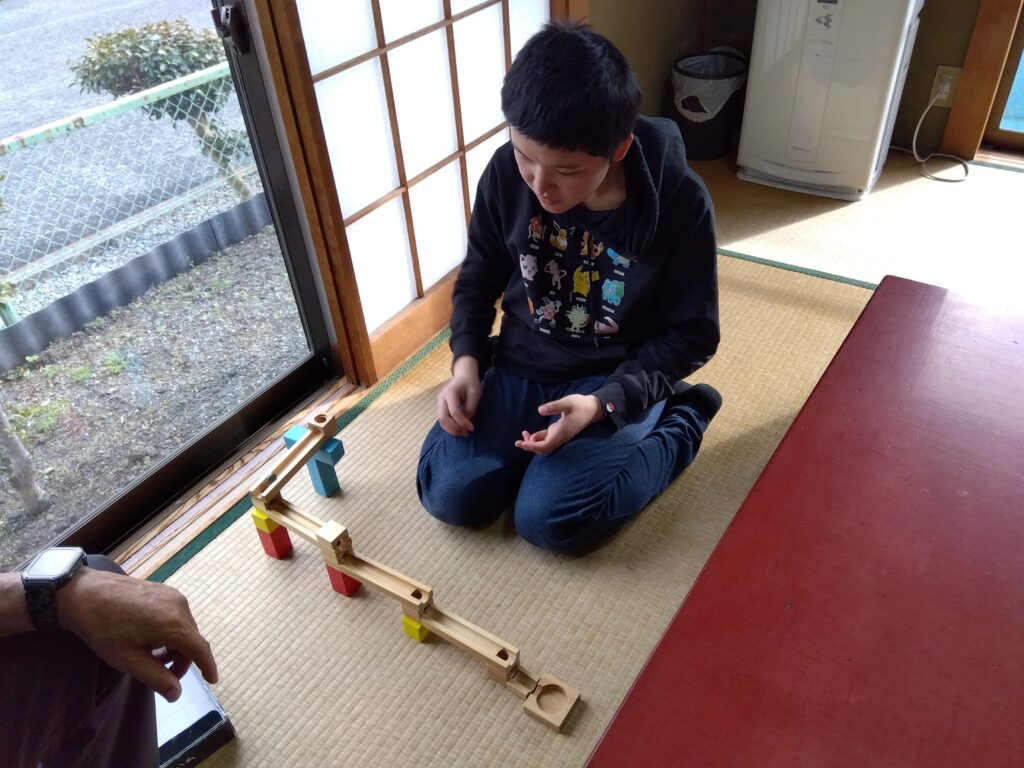 今日もこども達は元気に過ごしました。自由遊びではピー玉コロコロという玩具で遊んでいます😀積木のようなレールを作ってビー玉を転がそう!