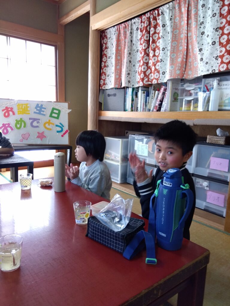 誕生者から頑張りたいことを皆に伝えてもらい、子ども達からもお祝いの言葉をかけられ、楽しい雰囲気に包まれながら誕生会を過ごしました。