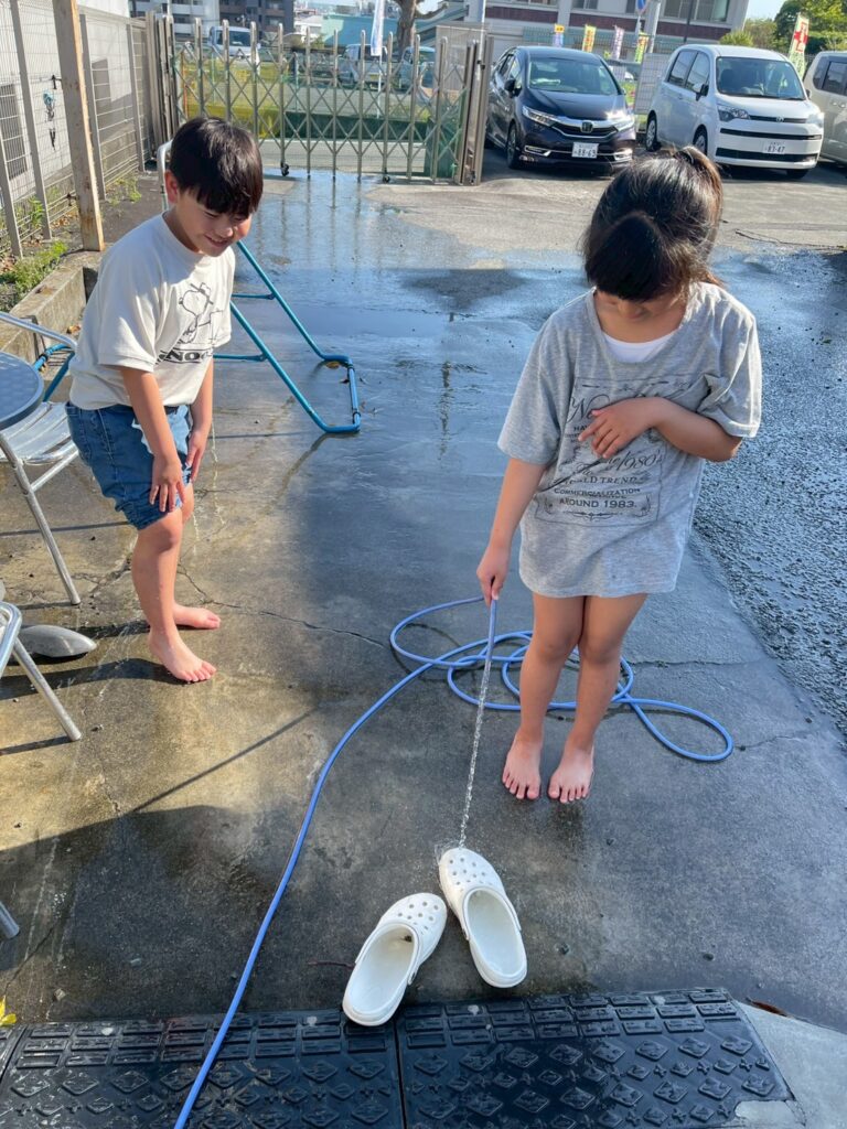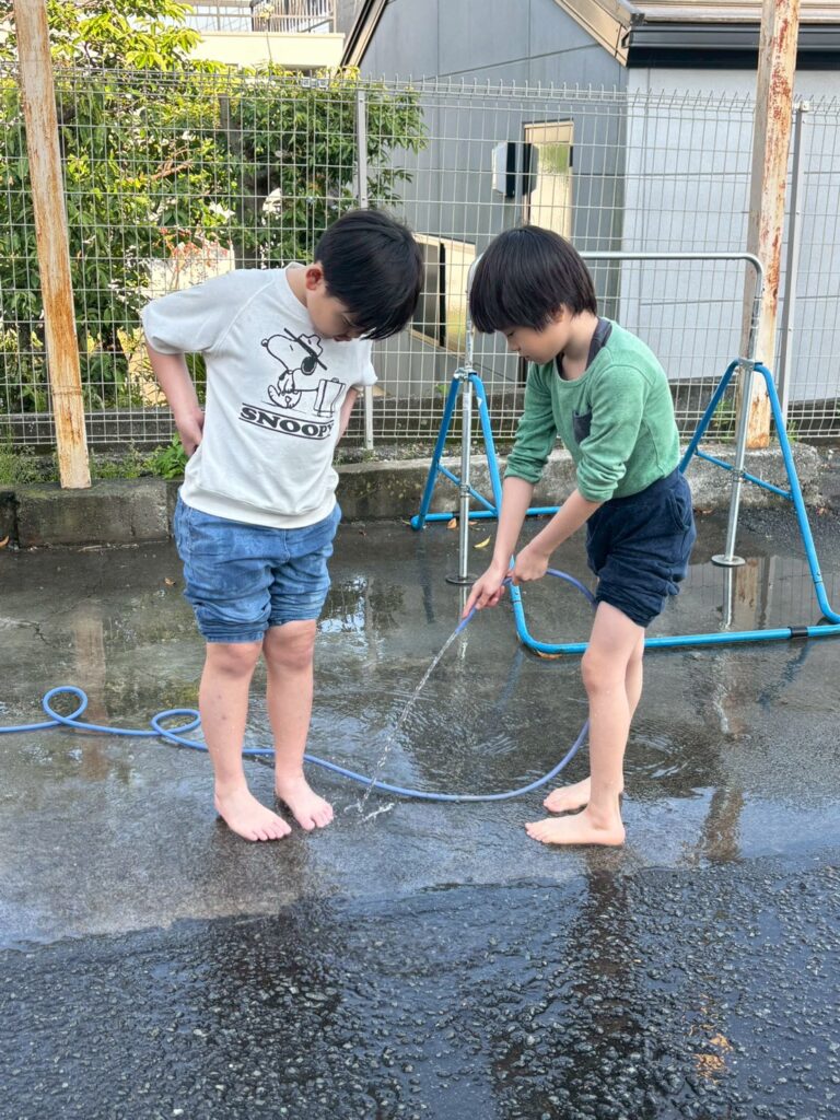外で水に触れて遊んだり
