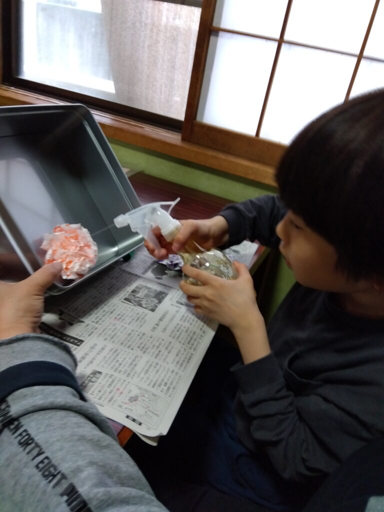 お花めがけて霧吹きでヒタヒタに。