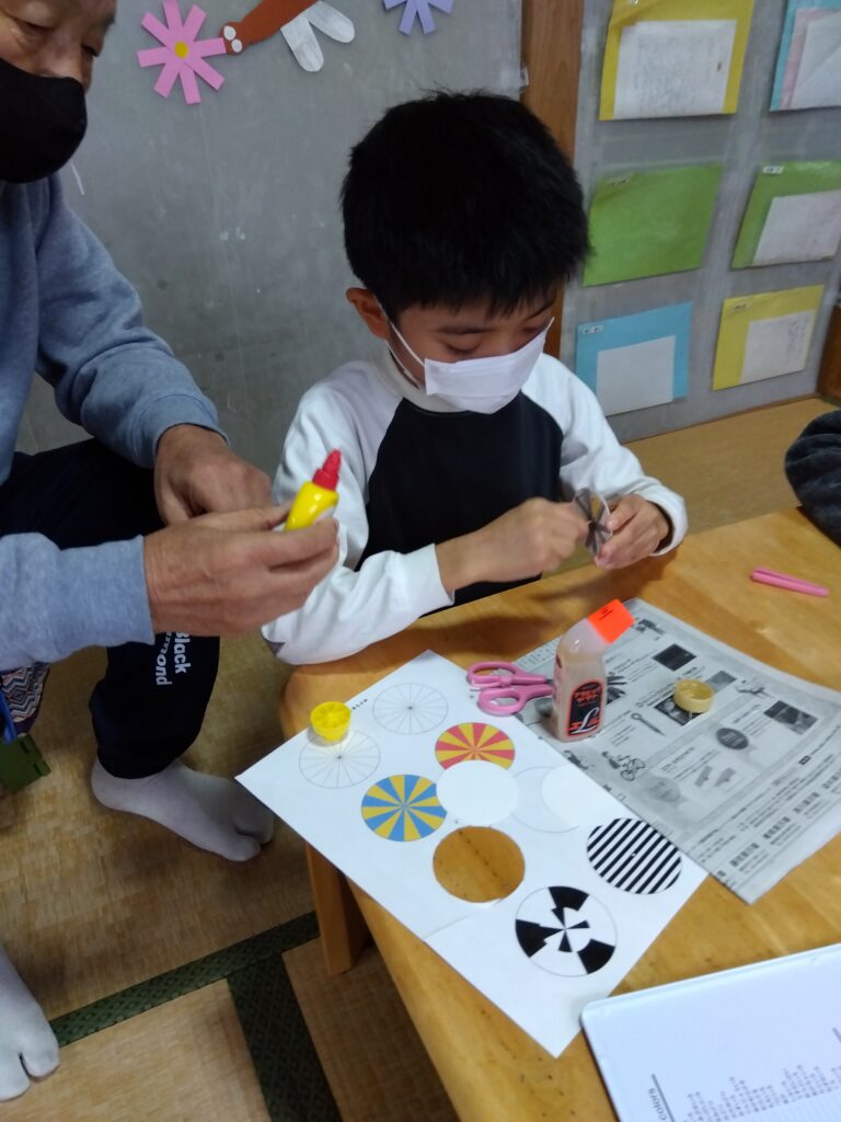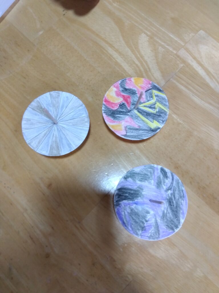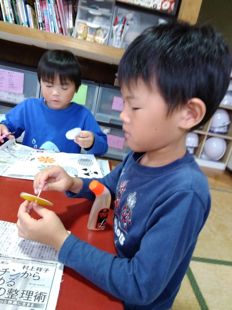 今日は、牛乳パックを使用してコマづくりを行いました。自分で模様や