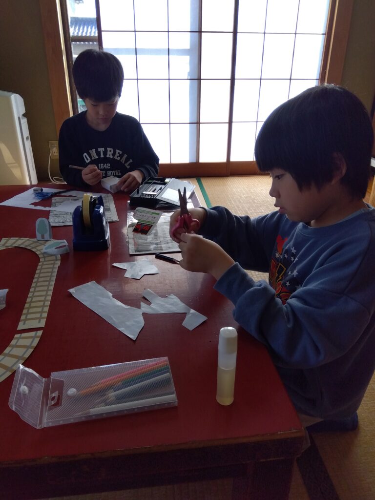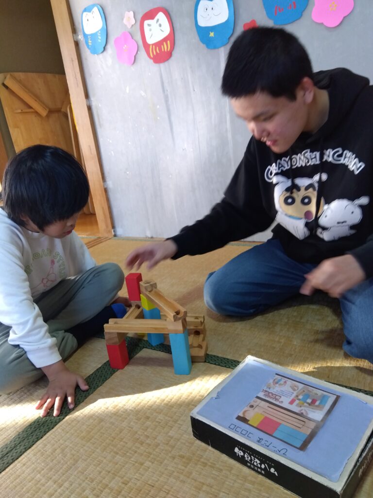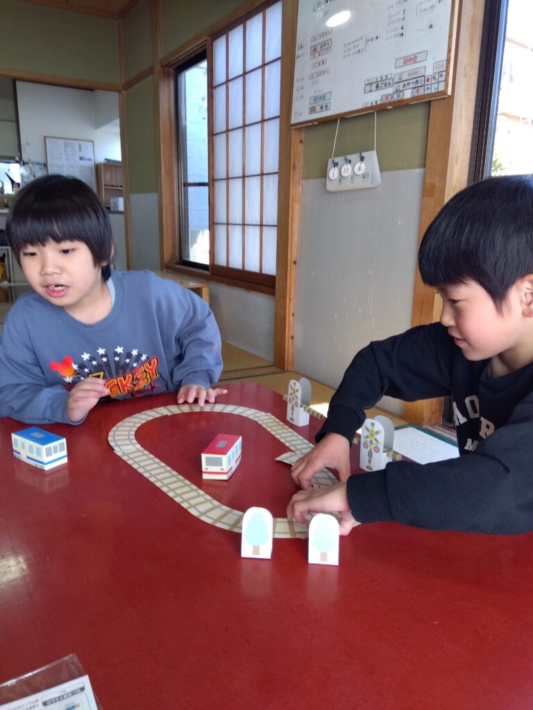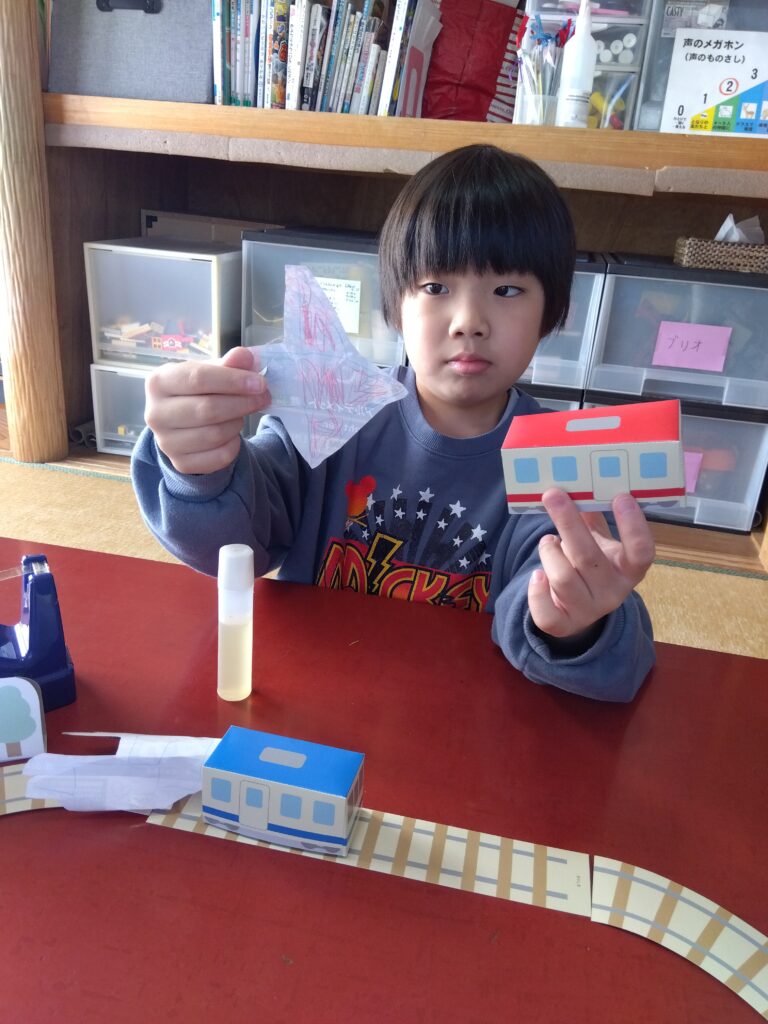 電車の工作キットを持ってきたお友達と一緒に、手作りの電車を作成し、線路の上を走らせていました☺️