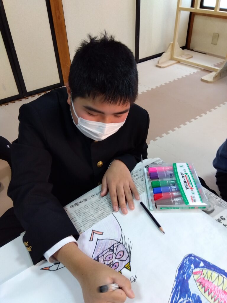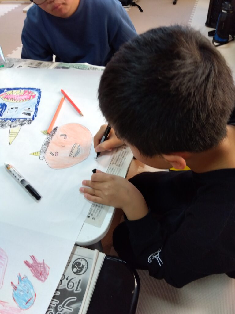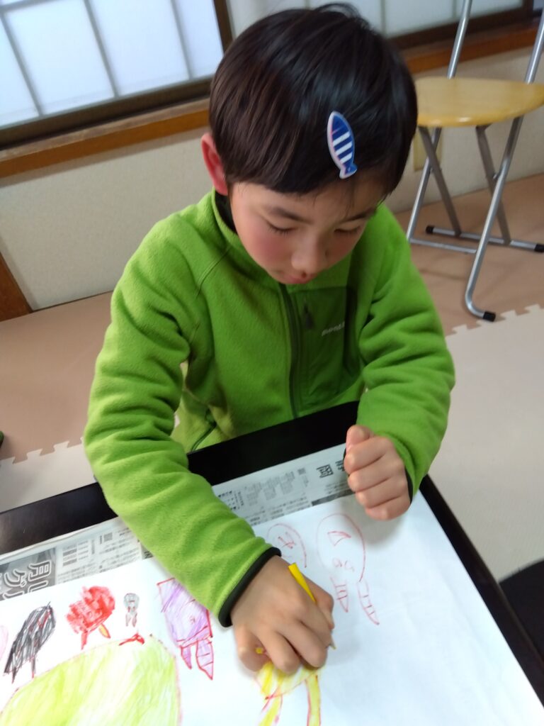 今日は節分も近いということで、みんなで鬼の絵を描きました